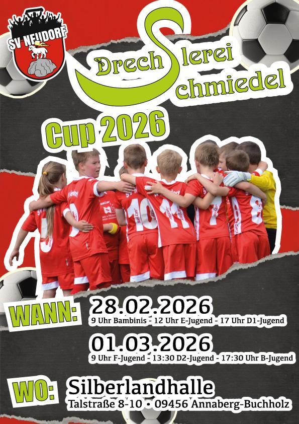 der SV Neudorf veranstaltet am 28.02. & 01.03.2026 in der Silberlandhalle in Annaberg mit dem Drechslerei Schmiedel Cup ein Hallenturnier für Jugendmannschaften. Anmeldungen sind noch bis 30.11.2025 bei Erik Kaufmann möglich (Kontakt: siehe Turnierausschreibung). Danach wird das Starterfeld bekannt gegeben und weitere Turnierinformationen folgen.